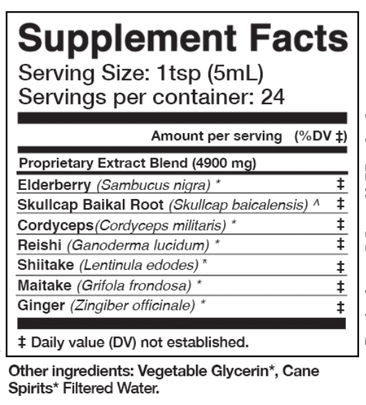 Each batch is crafted using a dual-extraction method—combining a slow decoction with organic alcohol and vegetable glycerin—to maximize the potency and full-spectrum profile of Elderberry and its companions. You’ll also find powerful mushrooms like Reishi, Maitake, Shiitake, and Cordyceps, paired with Baikal Skullcap and fresh Ginger—all chosen for their time-honored use in supporting the body’s natural defenses and overall vitality.*
